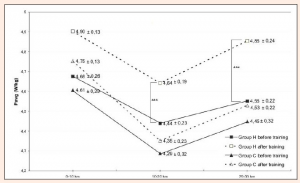 Durante la parte principal de la sesión de entrenamiento hipóxico, la intensidad se fijó a un 95% del umbral del lactato durante 30 minutos en el 1er microciclo, 35 minutos en el 2º microciclo y 40 minutos en el 3º microciclo.